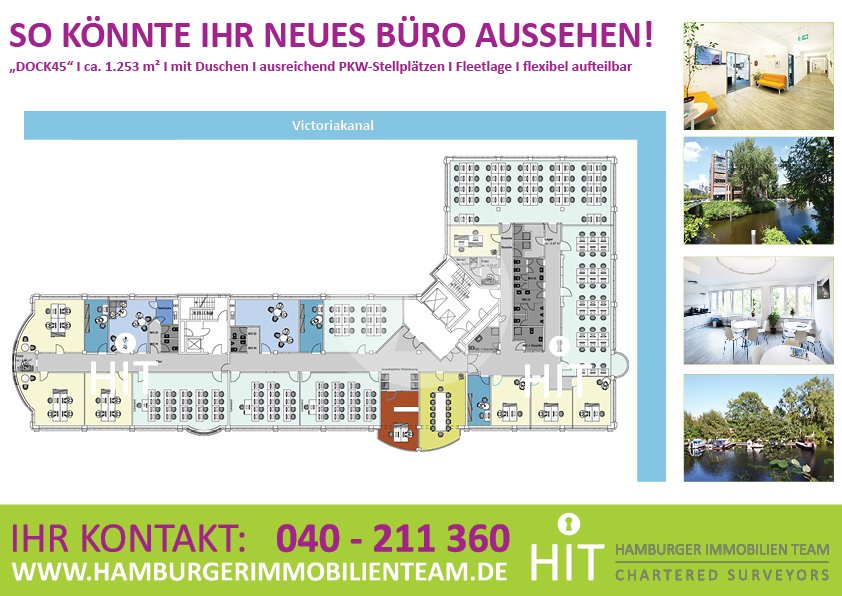 Gern zeigen wir Ihnen diese attraktiven Büroflächen im „DOCK45” in einer gemeinsamen Besichtigung. Rufen Sie uns einfach an. Wir freuen uns auf Sie. Tel: 040- 211 360 Mail: info@hamburgerimmobilienteam.de