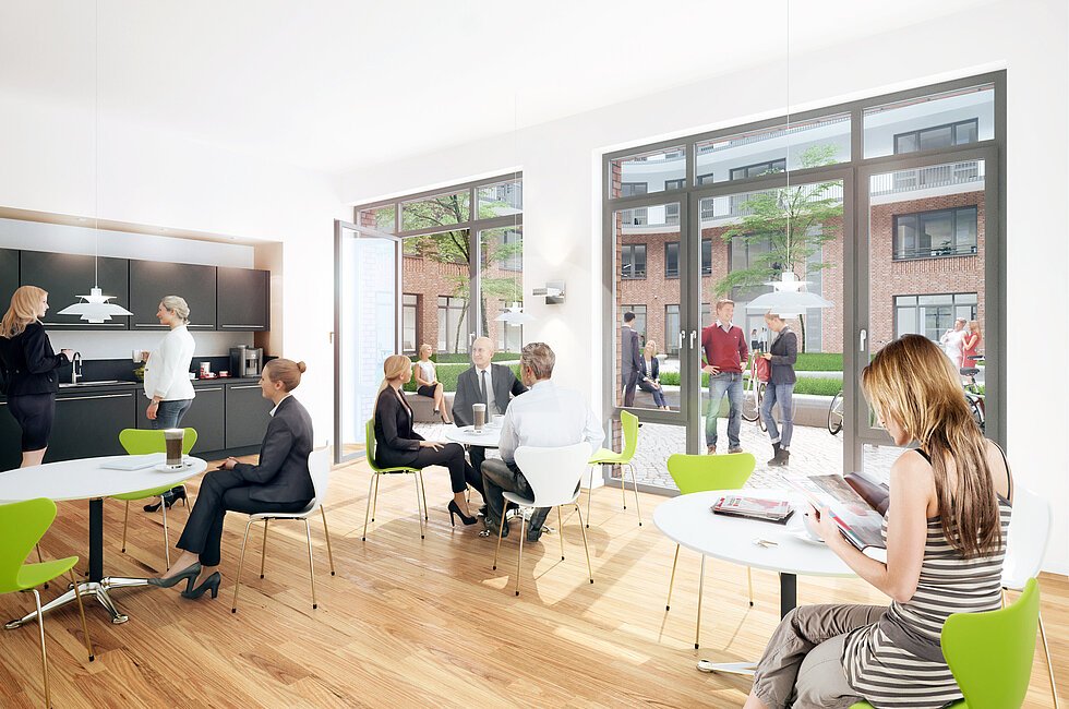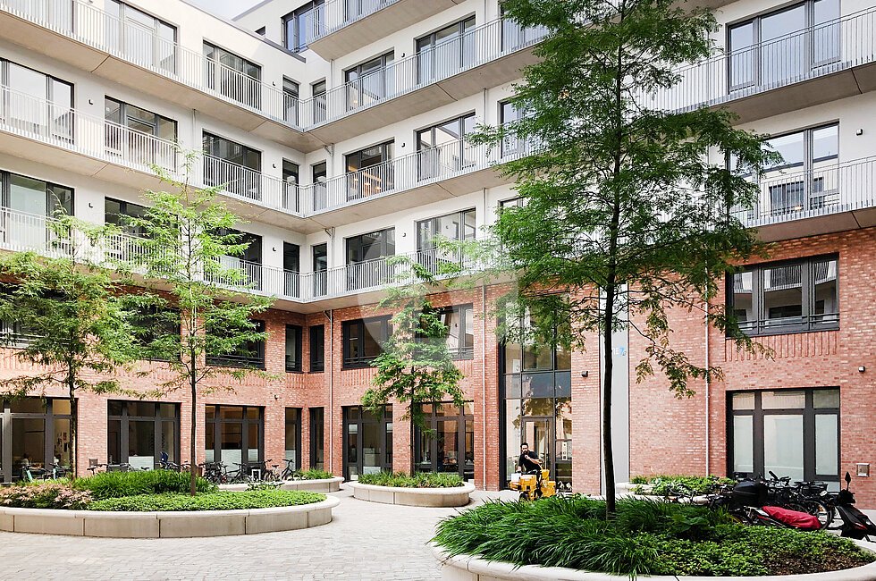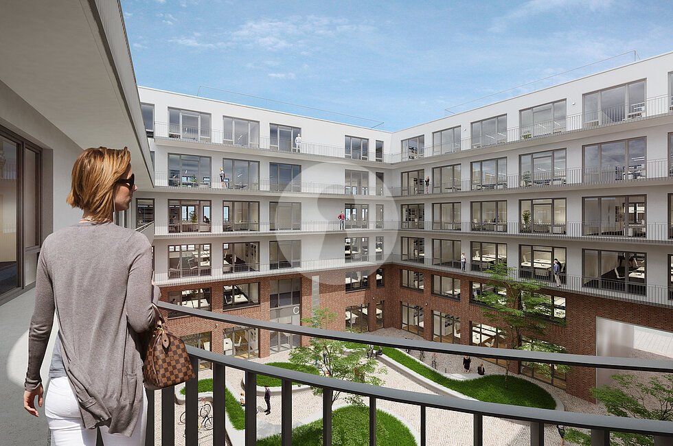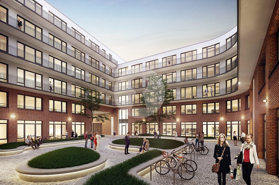 Über einen elegant gestalteten, einladenden grünen Innenhof erschließen Sie über die drei Haupteingänge Ihre neuen, sehr hellen und hochwertig ausgebauten Büros.