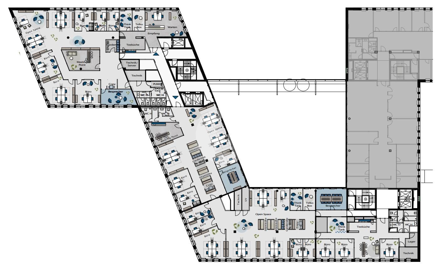 Bei dem hier zur Ansicht gestellten Bildmaterial handelt es sich um beispielhafte Mieterausbauten innerhalb des Gebäudes.