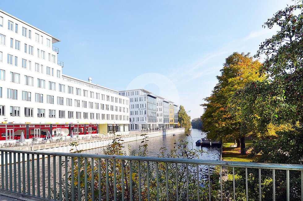 Teilweise verfügen die Büros über schöne Dachterrassen und Terrassen zur Wasserseite sowie bodentiefe Panoramafenster mit herrlichem Blick auf den Osterbekkanal.