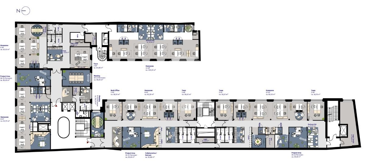 In Absprache mit den neuen Mietern werden die Mietflächen ausgebaut. Ob das open Space Konzept für kommunikatives Arbeiten oder das Einzel- und Doppelbüro für konzentriertes Arbeiten. Alles ist möglich.