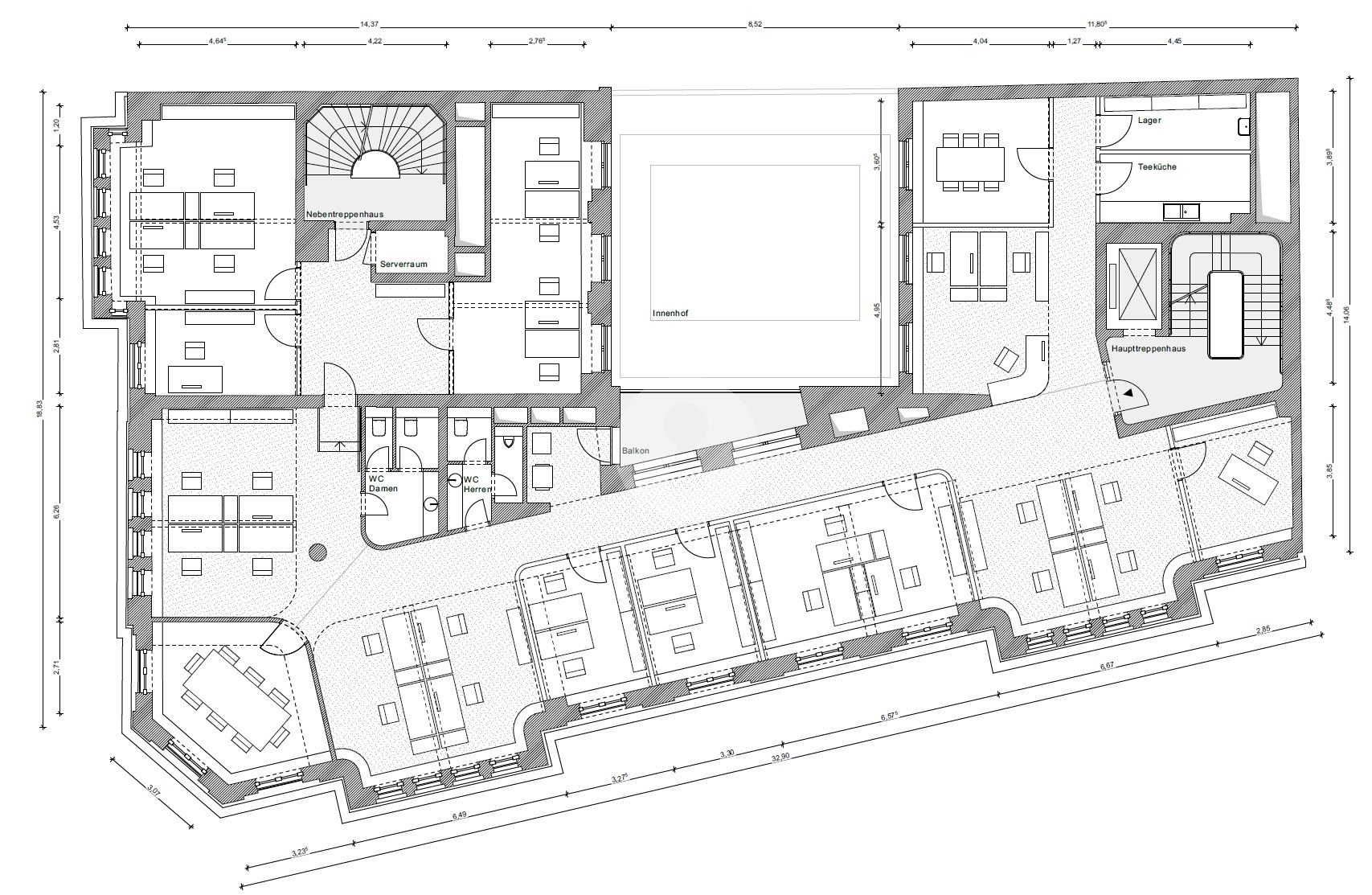 Auch der Grundriss präsentiert sich hoch flexibel. Ganz gleich, ob Einzel- oder Doppelbüro, Team- oder Gruppenbüros oder der kommunikative open Space. Alles ist möglich und wird entsprechend Ihrer Wünsche schlüsselfertig hergerichtet.